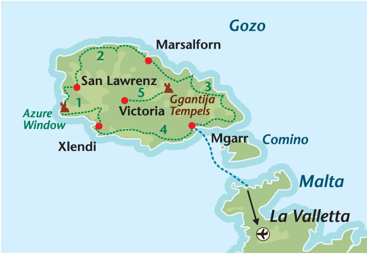 10,9 km.Overnachtingsschema|Gozo: Xlendi 5x, Victoria 2x, Malta: Valletta 3x