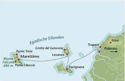 Levanzo is het kaalste en meest Afrikaanse van de drie Egadische eilanden. Het is ook het kleinste eiland van de drie (5 km2), goed voor één interessante dagwandeling. Hoe het eiland bij de oude Grieken heette is onbekend, de Romeinen noemden het Phorbantia. Het is wel het eiland met de vroegste geschiedenis. In de Grotta del Genovese, het hoofddoel van deze wandeling, zijn boeiende primitieve rotstekeningen te zien. Vanaf de westzijde van het eiland heeft u bij helder weer prachtig uitzicht op de oostkust van Marettimo. Vanaf hier loopt u door het grijze kalklandschap naar de andere kant van het eiland naar de mooie baai Minnola. Vandaar keert u weer terug naar het hoofdplaatsje. Zittend op een terrasje boven de haven kijkt u uit over de kalme zee en ziet u van ver al de draagvleugelboot aan komen varen die u weer naar Marettimo gaat brengen. Tijd voor de weldadige Mediterrane rust ....