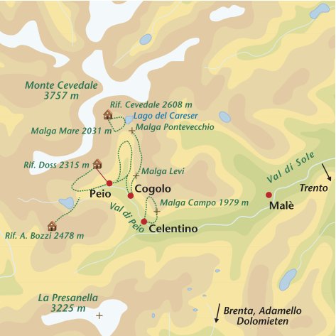 Na een korte transfer naar Malga Pontevecchio op 1750 meter stijg je naar ruim 2100 meter. Je loopt over de Sentiero Italia via Malga Levi en Malga Borche naar Cogolo. Daarna een ontspannen route langs de rivier terug naar het gehucht Masi Guilnova. Een wandeling met een dikke kans op marmotten en in de zomer veel koeien op hoge alpenweides. De uitzichten naar Peio Alto en de Val di Peio zijn fenominabel.
