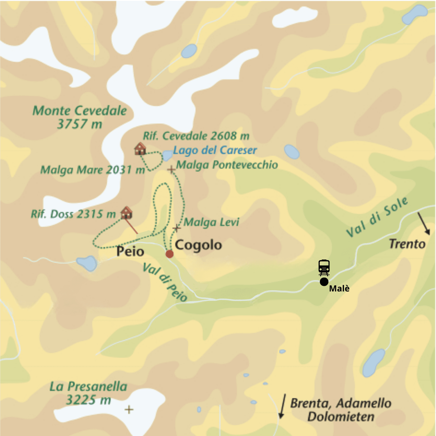 Rondwandeling vanaf parkeerplaats Prabon naar Malga Mare. Stevige klim naar het Càreser-meer op 2603 m., het kleine zwarte meer, Lago Nero, en naar keuze ook naar het hoger gelegen Marmottenmeer op 2704 m. Daarna afdaling naar de rifugio Larcher al Cevedale op 2608 m. en terug naar de Malga Mare. Via dezelfde route terug naar de parkeerplaats. Een tocht langs 3 gletsjermeren aan de voet van de Monte Stelvio.