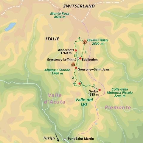 9 km.Overnachtingsschema|Gruba 1x, Gressoney St Jean 1x, Alpenzu Grande 1x, Anderbatt 1x, Orestes Hütte 1x, Edelboden (Gressoney St Jean) 1x