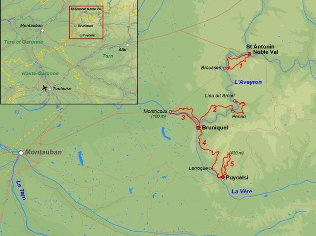 10,4 km.Overnachtingsschema|Saint Antonin Noble Val 2x, Bruniquel 2x, Puycelsi 2x