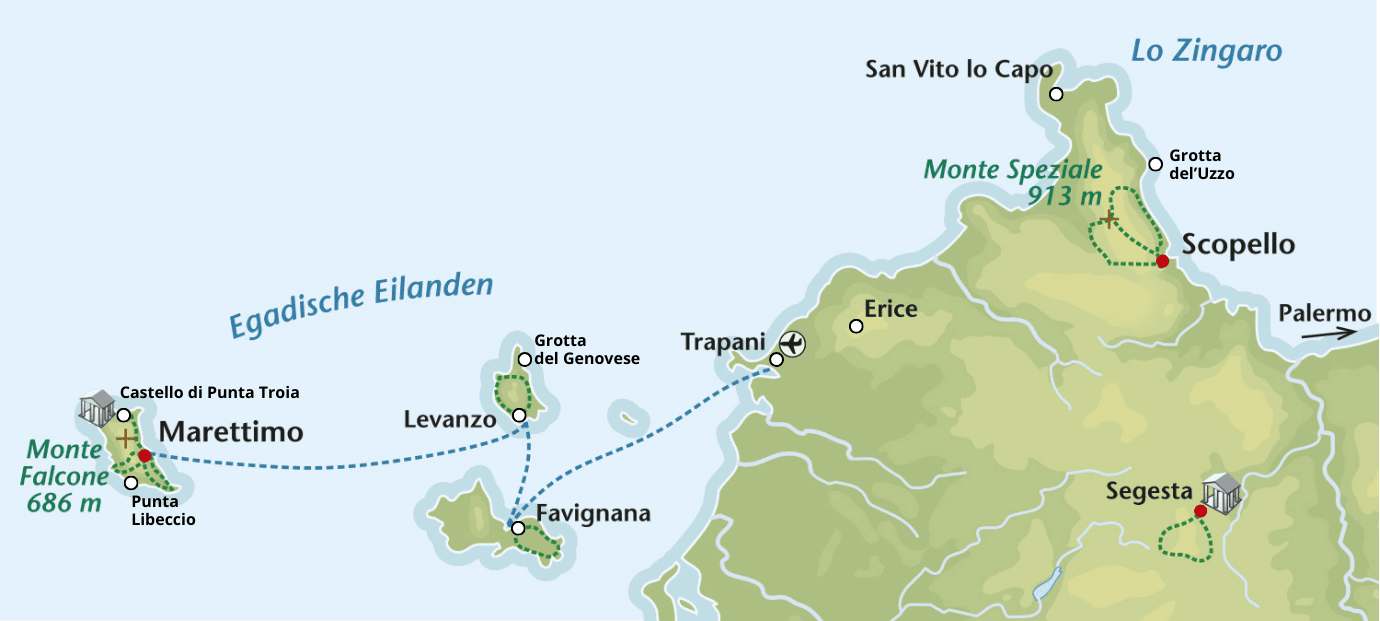 8 km.Overnachtingsschema|Marettimo 4x, Scopello 3x