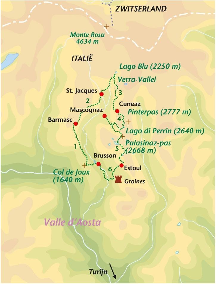 11 kmOvernachtingsschema|Brusson 1x, Barmasc 1x, Resy 1x, Cuneaz 1x, Mascognaz 1x, Estoul 1x, Brusson 1x