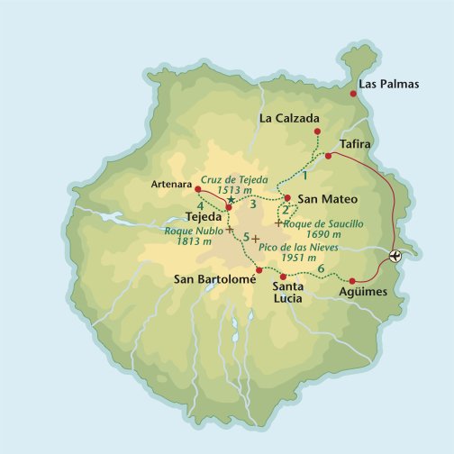 14,5 km.Overnachtingsschema|La Calzada 1x, Vega de San Mateo 2x, Tejeda 3x, Agüímes 1x