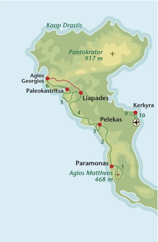 De trektocht begint aan het fraaie strand van Paramonas. Vanuit het onderkomen beklimt u de heuvelrug die er boven ligt. De stijging levert al snel de eerste fraaie uitzichten op over de westkust van het eiland. Als de rug is bereikt, slaat het zicht door naar de andere kant met uitzicht op een brede vallei en de oostkust van Korfoe. Er volgt een afdaling tussen de olijfbomen naar Pentati, eerste koffieplek. Van Pentati loopt u over een mooi voetpad naar toeristisch Agios Gordios. Een schilderachtig perceelweggetje en een klim over een oud voetpad brengt u in Aerostatos, restaurant/bar dat er staat vanwege ‘the scenic view’. Vervolg is over een oude weg (van voor het asfalt tijdperk) naar Pelekas. De laatste klim voert naar het uniek gelegen onderkomen, op de top van de heuvel, pal naast de ‘Kaisers Thron’. In de tuin met magnifiek uitzicht is er tijd om je af te vragen hoe dat ook al weer zat met Kaiser Wilhelm, Franz Joseph, Sissi en George V ...