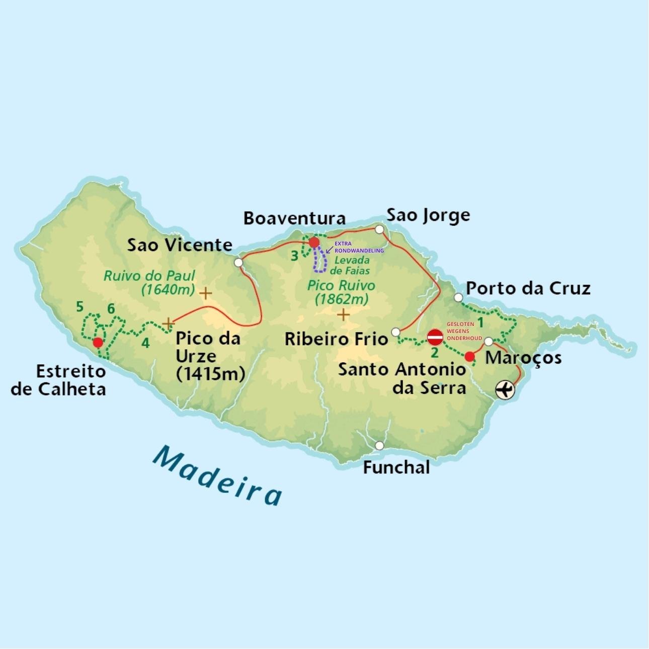 Korte transfer naar Maroços. Hier pak je de eerste levada van de trektocht op waarna je de ruige noordoostkust van Madeira gaat volgen. Na Boca do Risco volgt het pad halverwege de bijna loodrechte klifwand, gelukkig is er een balustrade aangebracht. Na Espigao Amarelo is het gedaan met de dieptes, ...