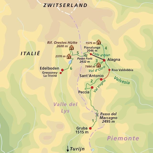 Een korte transfer brengt je naar de kabelbaan van Alagna om naar Pianalunga te gaan. Hier start je de beklimming van de Vallone d'’Olen. Vervolgens neem je de route naar Rifugio Città di Vigevano op 2863 m. en de laatste meters naar Col d'Olen op 2880 m. De ruige omgeving en het zicht op de Monterosa vergeet je nooit. De Vallone d’Olen is een vallei van glaciale oorsprong met de typische U-vorm, die van de zachte, groene alpenweiden loopt naar een steeds rotsachtiger en soberder, maanachtig milieu naarmate je hoger komt. Het is niet ongewoon om hier groepen onverstoorbare gemzen en steenbokken tegen te komen. De afdaling terug de Lys vallei in wordt gevolgd door korte stijging naar de Orestes Hütte, een van de meest gastvrije en ‘groene’ hutten in deze contreien. Voor wie last heeft van hoogtevrees is er een eenvoudige variant over een onverharde weggetje dat naar de Indren-sluizen leidt vlakbij de Orestes Hütte. Bij goed weer zwaardere, en hoogtevrees gevoelige variant mogelijk via Passo Foric (2.432m) en verder omhoog naar de Zube-pas 2.874 m.