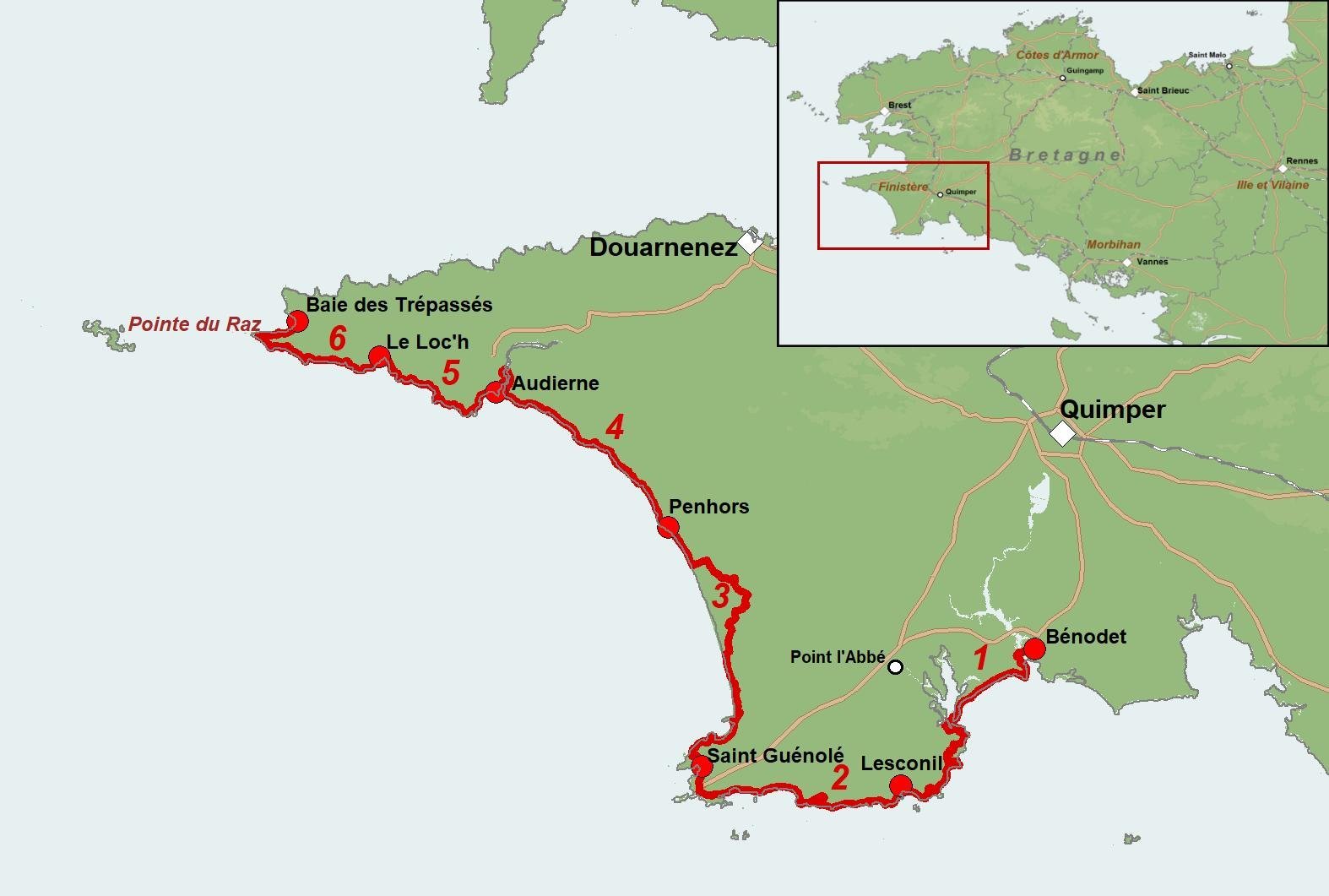 10,9 kmOvernachtingsschema|Bénodet 1x, Lesconil 1x, Saint-Guénolé 1x, Pouldreuzic 1x, Audierne 1x, Baie des Trépassés 2x