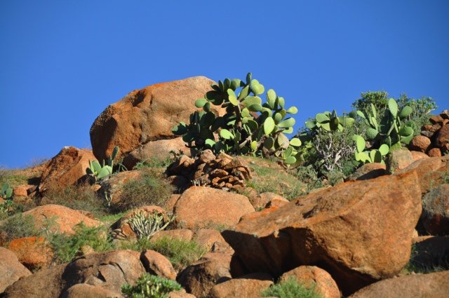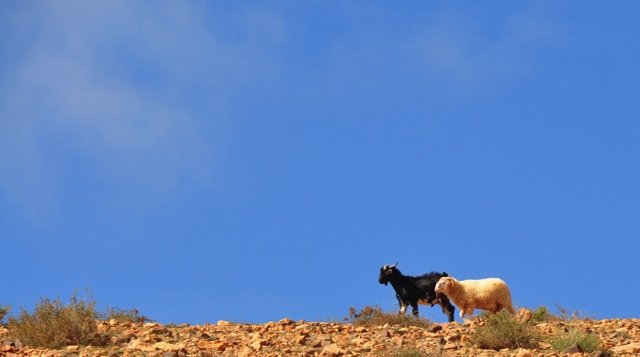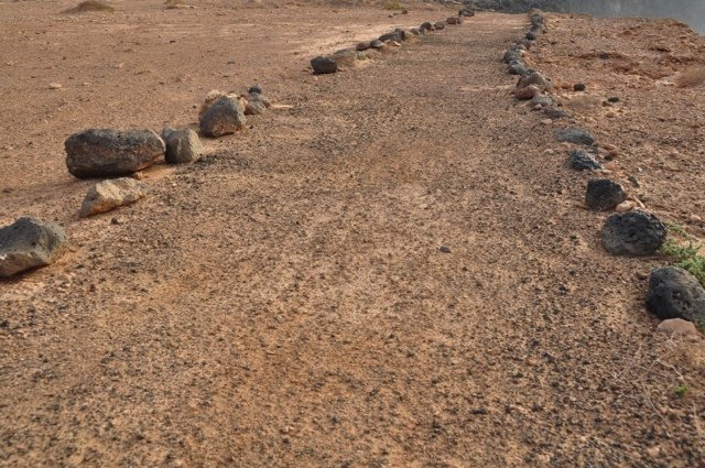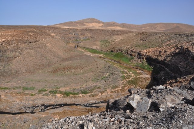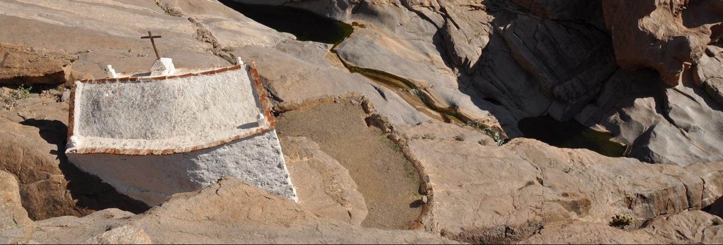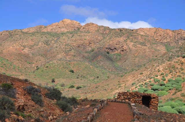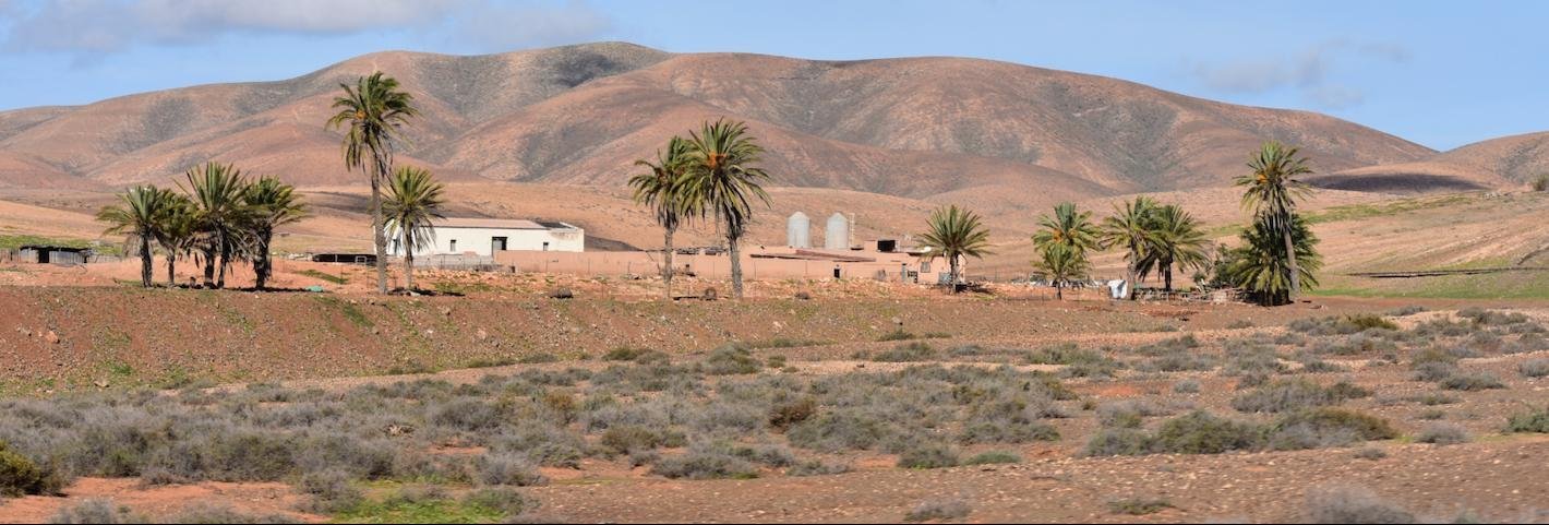 Stevige rondwandeling rondom Vega de Río Palmas. Je klimt vanuit het palmendal naar de 711 m. hoge Gran Montaña piek vanwaar een groots uitzicht over centraal Fuerteventura. Langs de ruggengraat van de bergketen loop je (deels over een onduidelijk pad) naar de Degollada de los Granadillos. In de diepte ligt het stuwmeertje en de piepkleine kapel Ermita de las Peñitas, waar je eventueel ook nog naar toe kunt lopen (ca. 4 km extra).