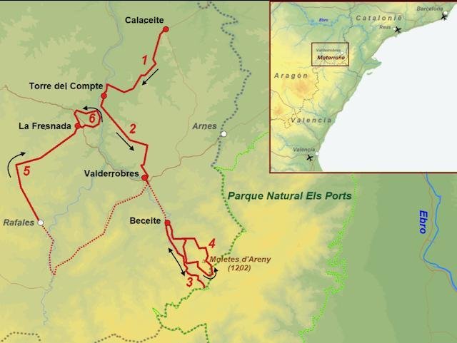 9 kmOvernachtingsschema|Calaceite 1x, Torre del Compte 1x, Valderrobres 1x, Beceite 2x, Fresneda 2x