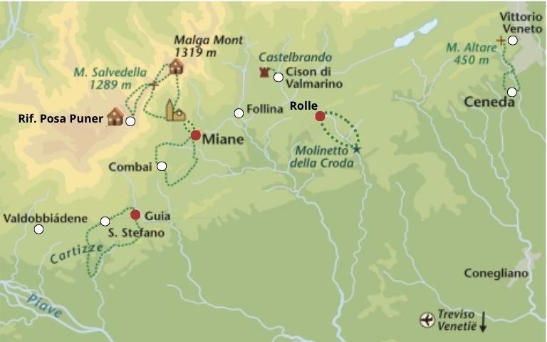 Een afwisselende rondwandeling van Miane naar het mooi gelegen Combai. U loopt via de wijngaarden van de witte Verdiso-druif omhoog naar de kastanjebossen en loopt een gedeelte van de 'Strada de la Fan', de hongerroute waar ieder najaar (eind oktober) het kastanjefeest wordt gevierd. Na een stop in Combai klimt u omhoog naar het kerkhof vanwaar u prachtig uitzicht heeft op de heuvels waar u eerder liep en het dal naar Miane.Meer uitzichten in een zuidelijker gelegen dal van Campea verderop in de route.