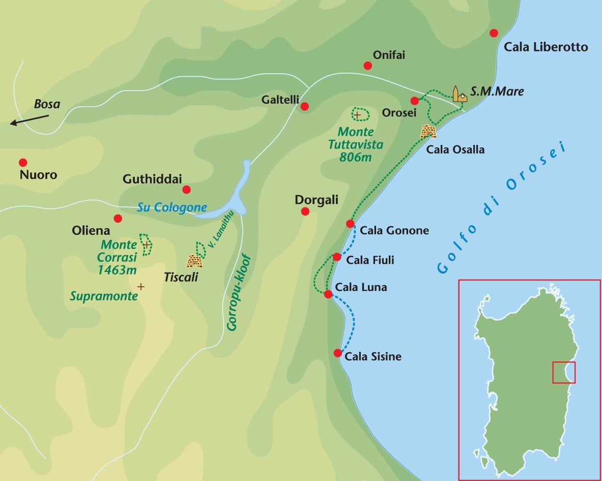 Deze mooie wandeling vanuit Dorgali naar de haven van Cala Gonone voert over paden ooit in gebruik voor het transport van houtskool en bielzen die werden gewonnen uit de op Sardinië veelvuldig voorkomende steeneik. Via een oude tunnel of een mooie pas steekt u het gebergte door dat de twee plaatsen van elkaar scheidt en bereikt u over onverharde wegen en paden het strand. Onderweg is het genieten van schitterende uitzichten op zee en kunt u Nuraghe Mannu bezoeken en aan het einde neemt u een heerlijk duik in zee of het wordt genieten van een terrasje aan de kust. Vanaf Cala Gonone reist u per bus terug naar het beginpunt.