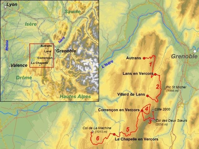 16,2 km.Overnachtingsschema|Autrans 1x, Lans en Vercors 1x, Villard-de-Lans 1x, Corrençon 1x, la Chapelle 1x, Col de la Machine 1x