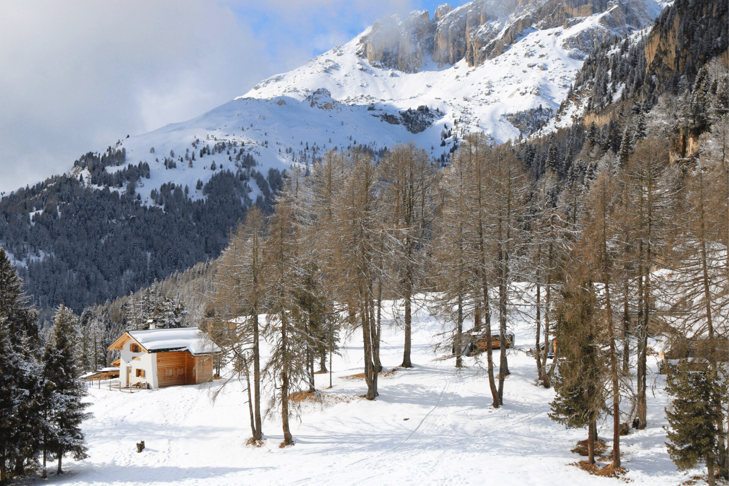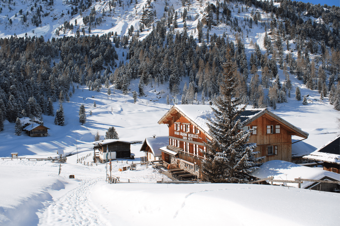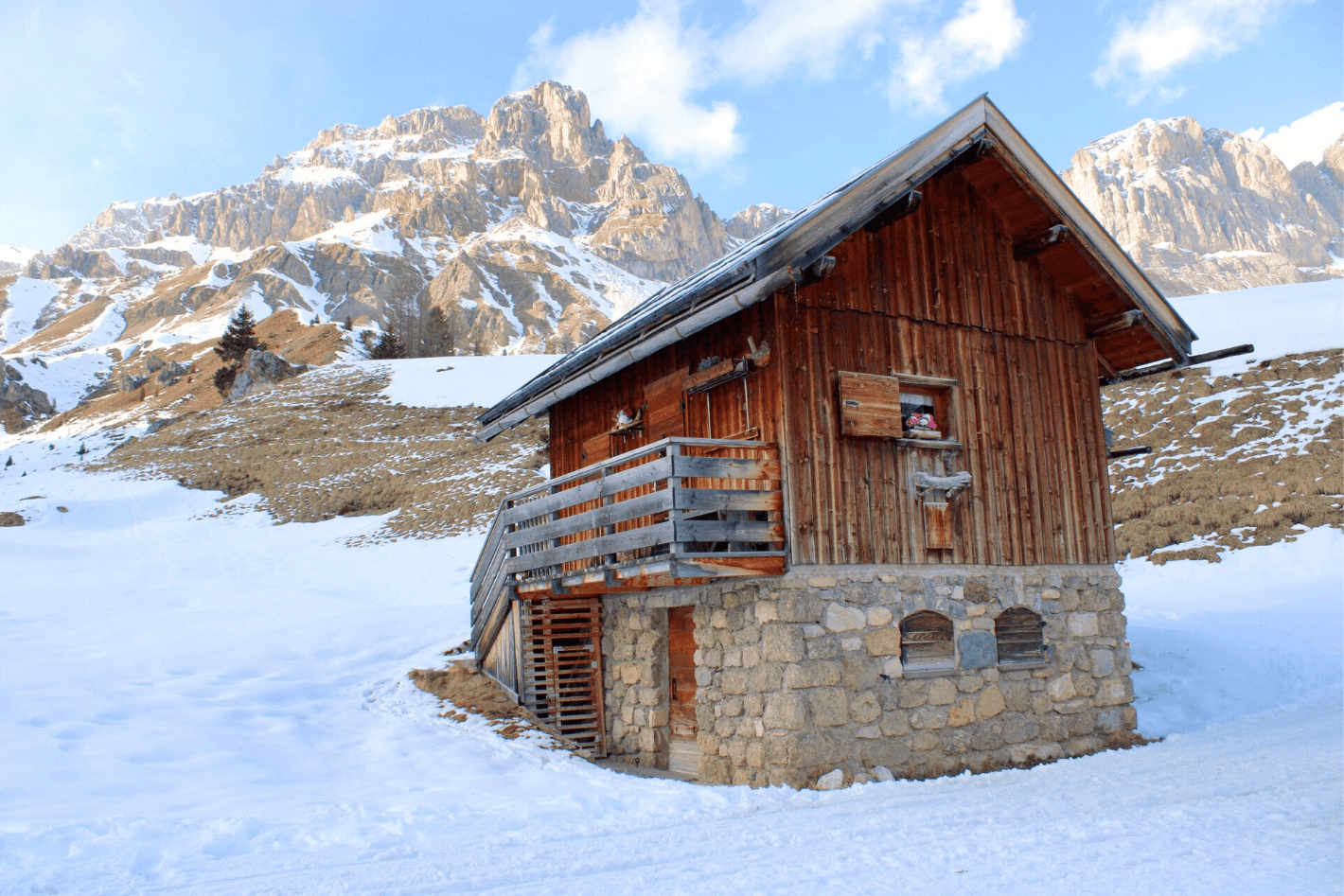 Na het ontbijt in de rifugio is het tijd om af te dalen door de Val Duron naar de bewoonde wereld. Via Baita Fraines loop je naar het kleine dorp Pian, een van de oudste nederzettingen in Val di Fassa vol fraaie houten Ladino-huizen in tradionele stijl. Je loopt vervolgens verder tot je beneden Campitello weer bereikt. In Campitello is er een gevarieerde keuze aan lokale restaurants voor de lunch. Na de lunch kan je een korte winterse (rond)wandeling maken van Campitello naar Canazei en terug. Vervolgens word je per transfer naar je eerste hotel gebracht om de bagage op te halen. Hierna brengt een transfer je naar de volgende berghut op 1800 meter hoogte in de omgeving van Passo San Pellegrino.