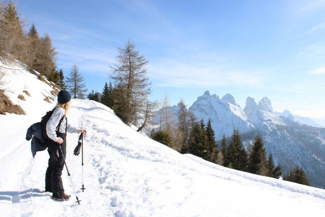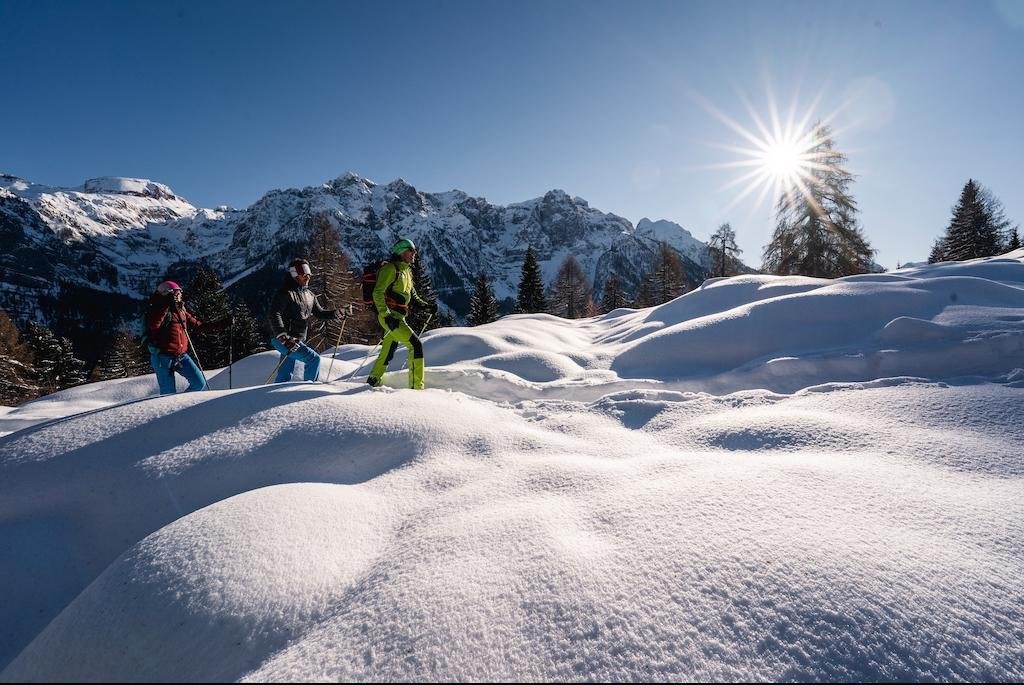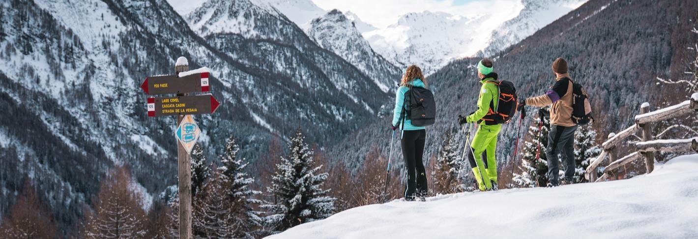 Dit is een langere tocht, omdat het een combinatie is van twee winterwandelingen: Sentiero Valpiana en Sentiero Degli Gnomi. Je start de wandeling wanneer je de skibus in het dorp Fucine (983 meter hoog) verlaat. Vanaf hier loop je richting Ossana, beroemd van het imposante kasteel di San Michele. Hierna ga je de hoogte in. Je volgt een relatief steile, beboste weg die naar Valpiana (1370 meter hoog) leidt. Hoewel het mogelijk is om over de besneeuwde geasfalteerde weg te lopen, is het ook een optie om het wandelpad te kiezen. Eenmaal aangekomen in de vlakke vallei van Valpiana, word je getrakteerd op bijzondere winterse vergezichten. De majestueuze toppen van de Ortles-Cevedale-groep doemen achter je op, met als pronkstuk de Vioz (3.645 m), terwijl voor je het landschap van Corno di Valpiana, Cima di Bon en Monte zich uitstrekt. Neem bij Malga Valpiana even de tijd om tot rust te komen voordat je verder wandelt richting Lago dei Caprioli. Daarna vervolg je jouw tocht over het bekende Sentiero Degli Gnomi. De route eindigt in het dorpje Pellizano waar je de bus neemt op de doorgaande weg (via Nazionale) of je loopt door naar de start in Fucine.